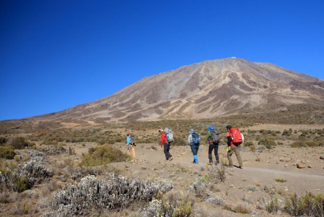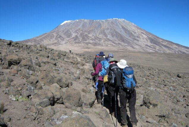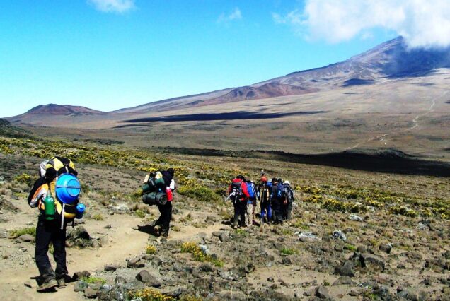 The morning walk is a steady ascent up to the ‘Second Cave’ (3,450 m.) with superb views of Kibo and the Eastern icefields on the crater rim. After lunch, we leave the main trail and strike out across the moorland on a smaller path towards the jagged peaks of Mawenzi. Our “Upper Kikelewa” campsite is on a small plateau above a sheltered valley with giant senecios past Kikelewa Caves (3,750 m.) [7-8 hours walking]